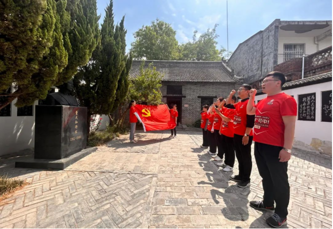 在董天知將軍的雕像前,參加活動的黨員整齊列隊,懷著無比崇敬的心情,莊嚴(yán)地舉起右手,重溫入黨誓詞?!拔抑驹讣尤胫袊伯a(chǎn)黨……”鏗鏘有力的誓言響徹故居上空,久久回蕩。這不僅是一次對革命先烈的莊嚴(yán)告慰,更是黨員們對自己初心使命的再次堅定與強化。